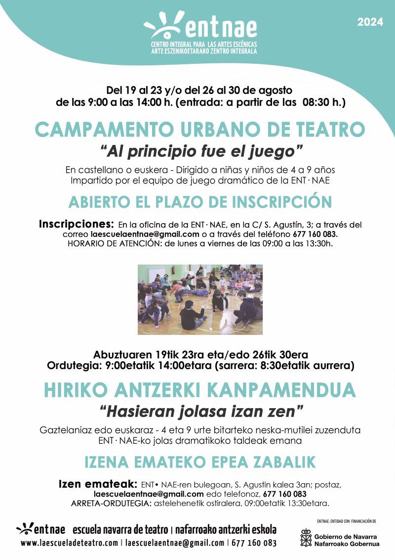 ¡Si quieres acercarte al teatro de una manera lúdica, creativa y placentera, te proponemos que vengas a la Escuela Navarra de Teatro una o dos semanas este verano para dar rienda suelta a tu creatividad e imaginación. Nos expresaremos hablando, cantando, bailando… Nos divertiremos a través de juegos, propuestas y dinámicas teatrales. También daremos un espacio a la calma, al silencio, a la respiración y la relajación. Sólo tienes que traer ganas de disfrutar, ropa cómoda y un pequeño almuerzo!